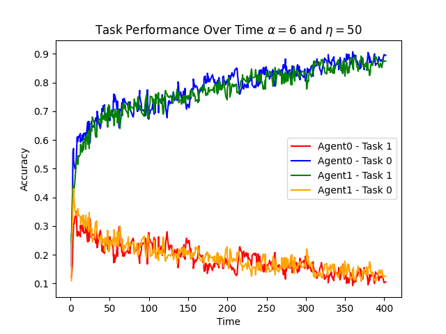 This figure shows the specialization of two agents on two tasks based on a certain configuration of the hyperparameters.